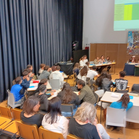 Apesar da exigência de mudança de horário, o auditório encheu-se para assistir ao debate entre as 12 equipas de 11.º ano participantes, com a colaboração dos professores que se prontificaram a levar as suas turmas.